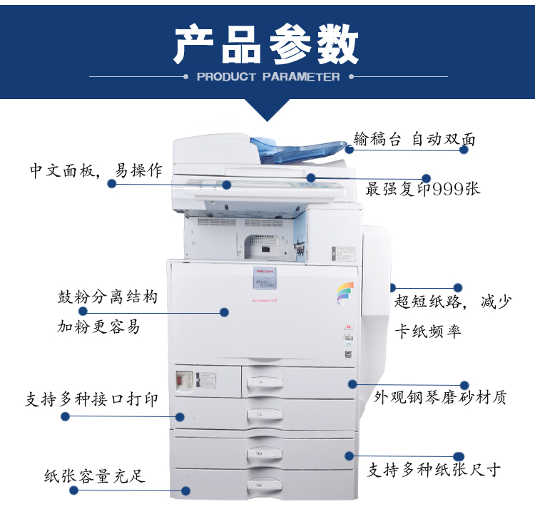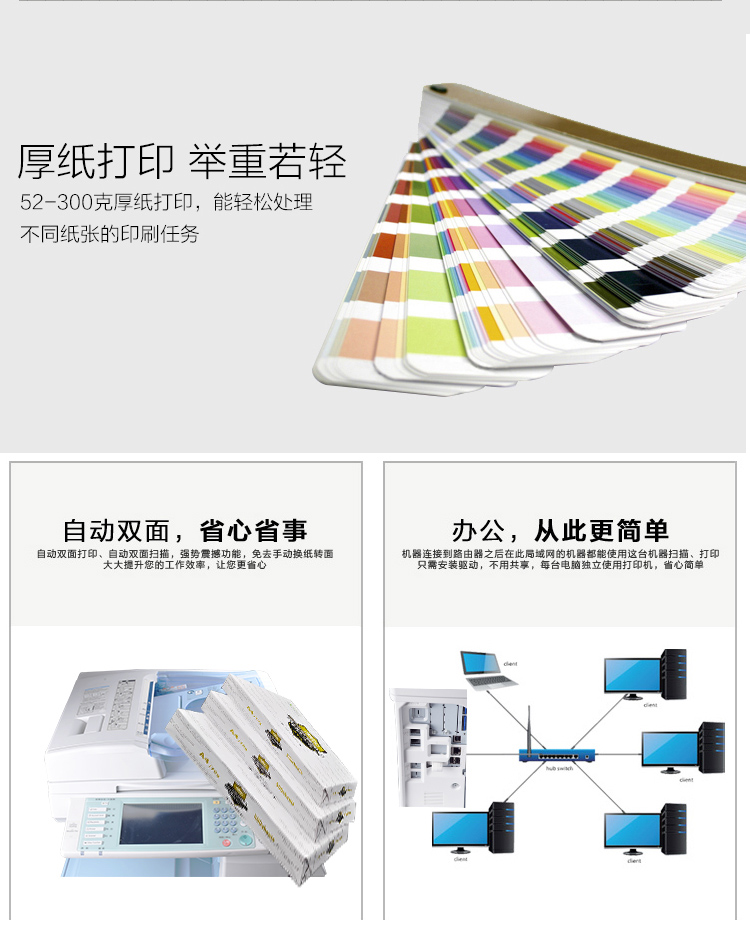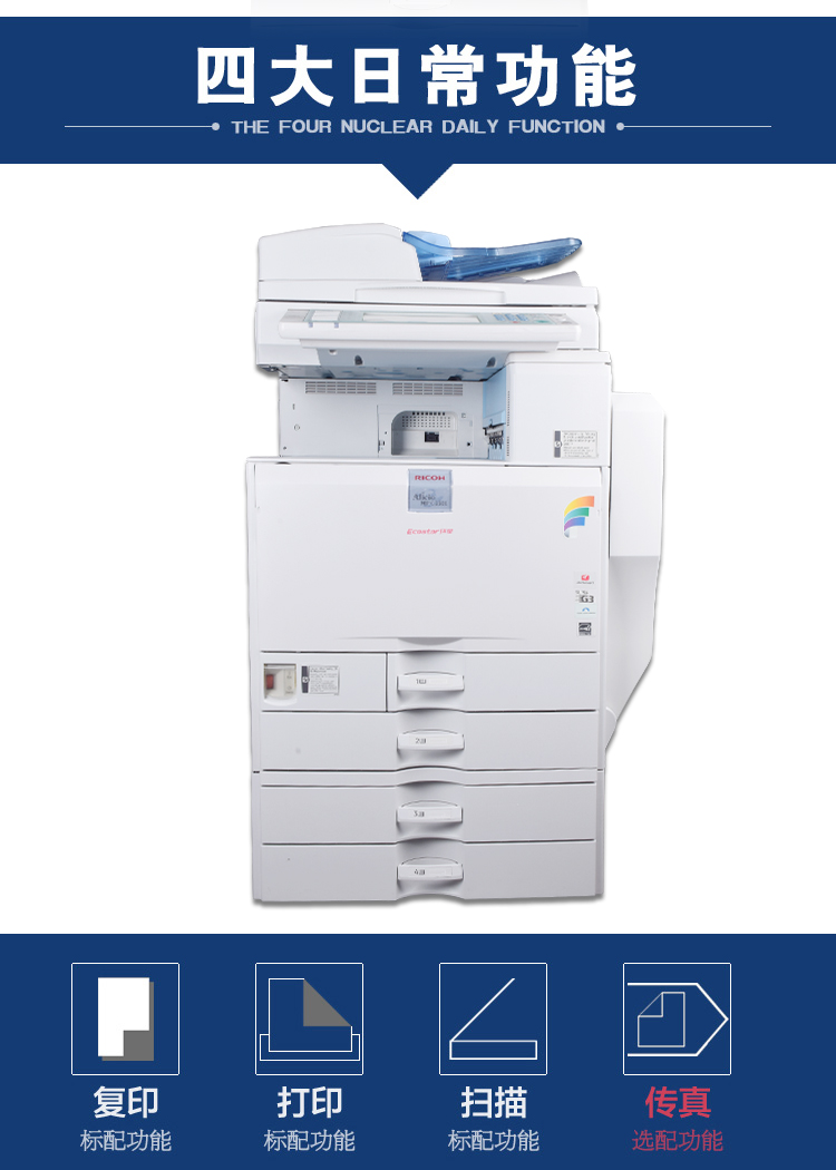 功能:標(biāo)配4紙盒/彩色雙面網(wǎng)絡(luò)復(fù)印/打印/掃描