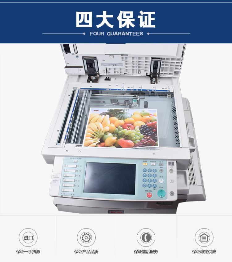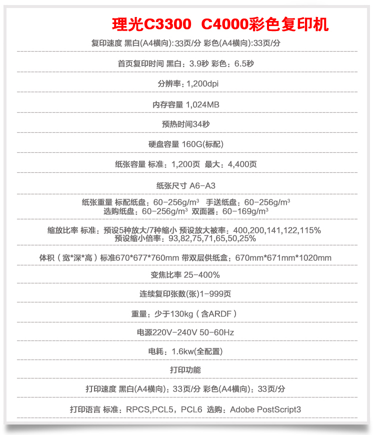 描述:數(shù)碼復(fù)合機(jī):涵蓋功能:打印/復(fù)印/掃描/傳真。分辨率:1200*1200dpi。復(fù)印比例:25-400%。理光Aficio MP C3300數(shù)碼復(fù)合機(jī):特性:原稿類型:紙張書籍物體。