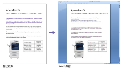 掃描數(shù)據(jù)可轉(zhuǎn)換為Microsoft®Word和Excel®格式的文檔。即使文檔僅為紙質(zhì)文件,也可以轉(zhuǎn)為可編輯電子文檔??蓪D表、插圖轉(zhuǎn)換為適合復(fù)制的Microsoft®Word和Excel®格式。
