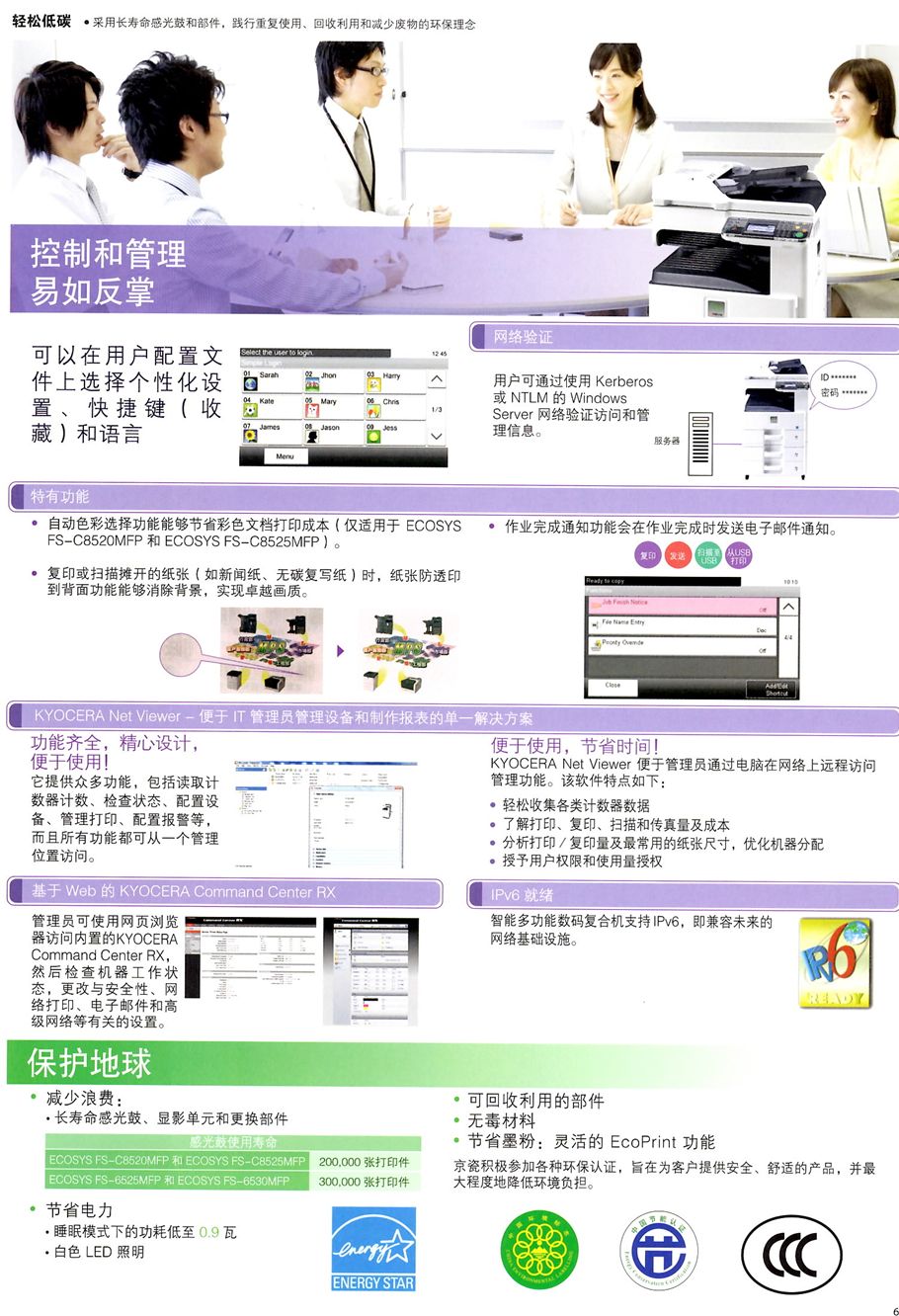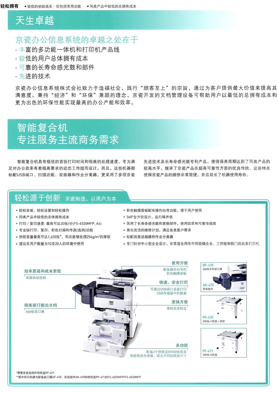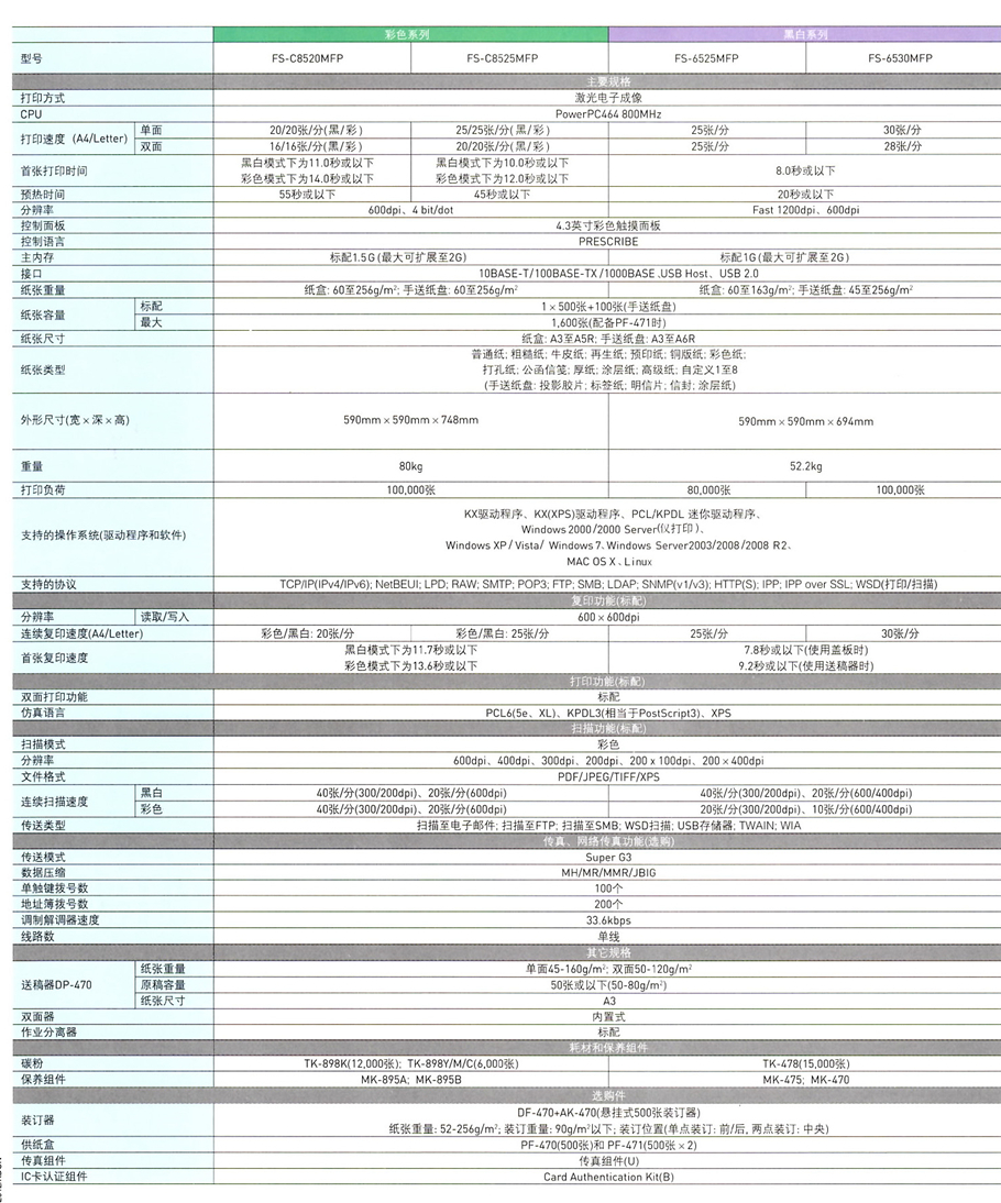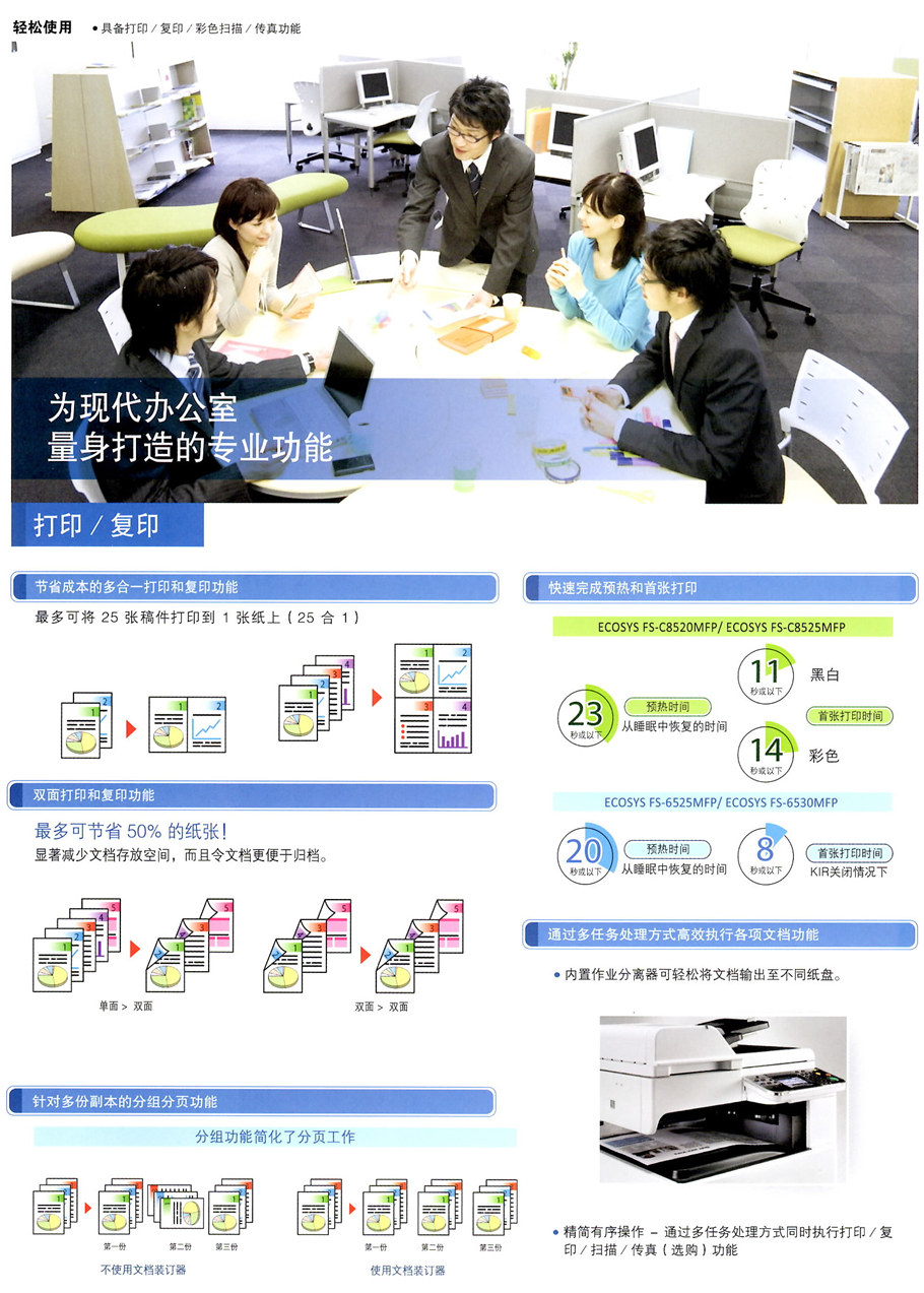 描述:4.3英寸彩色觸摸式面板,便捷的操作性、人性化設(shè)計(jì)的用戶使用界面/卡紙率低,卡紙排除便利/京瓷獨(dú)創(chuàng)的長壽命、高品質(zhì)非晶硅感光鼓/維修服務(wù)便利/可選購傳真組件/25頁/分鐘,打印速度快