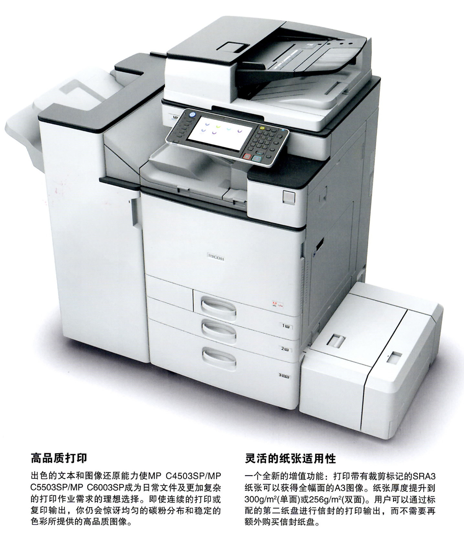描述:(理光辦公型高端彩色一體機性能卓越!辦公高效?。?打印分辨率提升到1200x1200dpi/2bit 最大可支持SRA3(320x450mm)尺寸紙張輸出雙面紙張重量可達256g/m2 標(biāo)配信封供紙盤包括內(nèi)置裝訂器在內(nèi)的更多全新選購件送稿器供紙能力進一步改善(ARDF擴展到100頁,SPDF擴展到220頁)海報打印功能可實現(xiàn)無書釘小冊子折疊。